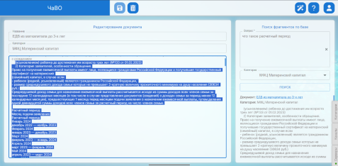 *блок '''«Редактирование документа»''' с полями: «Название», «Категория» и текстом выбранного файла, который можно редактировать. Можно переименовывать файл и название категории, после чего нужно сохранить изменения. | *блок '''«Редактирование документа»''' с полями: «Название», «Категория» и текстом выбранного файла, который можно редактировать. Можно переименовывать файл и название категории, после чего нужно сохранить изменения. | ||