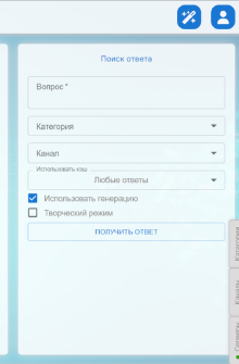 Блок «Поиск ответа» (рисунок 7) работает так же, как кнопка «Задать вопрос» на вкладке «Документы». Он включает в себя поле для ввода текста вашего вопроса, выпадающий список с категориями (если категория не указана, ответ будет сформулирован на основании всех документов в базе данных), список созданных каналов и меню «Использовать кэш». В этом меню можно выбрать, использовать ли только проверенные ответы или любые. Кэш-память позволяет сервису быстрее отвечать на запросы пользователей. А опция «Только проверенные ответы» гарантирует, что ответы, которые получает пользователь, были отредактированы и проверены оператором.