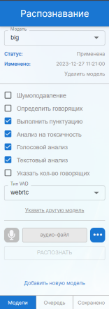 Ниже под флажками располагаются: раскрывающийся список '''«Тип VAD»''' (тип модели для разбивки аудиофайлов: webrtc и neuro) и кнопка '''«Указать другую модель»'''. При нажатии на кнопку появляется раскрывающийся список, в котором можно выбрать встроенную модель из списка (big или call), она становится приоритетной. | Ниже под флажками располагаются: раскрывающийся список '''«Тип VAD»''' (тип модели для разбивки аудиофайлов: webrtc и neuro) и кнопка '''«Указать другую модель»'''. При нажатии на кнопку появляется раскрывающийся список, в котором можно выбрать встроенную модель из списка (big или call), она становится приоритетной. | ||