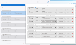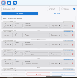 Условия запуска. Для каждого действия есть возможность настроить свои условия запуска. Если нажать на кнопку «Условия запуска», откроется меню, в котором можно задать условия для выполнения действия. Этих условий может не быть, либо они могут быть представлены одним элементом данных, либо сочетанием нескольких элементов, связанных логическим оператором «И». Также можно указать несколько условий, объединённых логическим оператором «ИЛИ». Каждый элемент условия имеет один из типов: