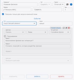 Исключения есть трех типов Тишина, Не найдено и Нет данных. При Тишине, когда пользователь молчит, можно выставить одно или несколько исключений подряд (параметр Макс. кол-во исключений подряд) и если были выполнены эти исключения подряд, то можно выполнить определенные действия: Сказать, Завершить диалог или Передача диалога. Также здесь указано время жизни сессии в секундах. Это означает, что по истечении заданного периода сессия будет завершена.