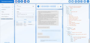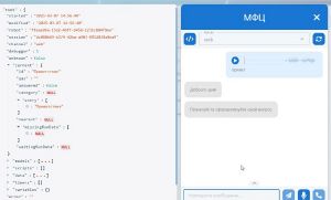 В интерфейсе SES есть чат с отладчиком (рис. 22), где вы можете протестировать работу сценарной машины. Чтобы открыть чат-отладчик, нажмите на значок [[Файл:Чат.png|безрамки|20x20px]] в правом нижнем углу рабочей области. В самом верху располагается выпадающий список с каналами связи. Справа от списка — кнопка '''«Перезапустить сессию»''' [[Файл:Обновить данные вопроса.png|безрамки|20x20px]], которая сбрасывает всю переписку и данные отладчика. А слева — кнопка '''«Данные сессии»''' [[Файл:Кнопка отладчик без полей.png|безрамки|20x20px]], предоставляет возможность в режиме отладки увидеть все данные, полученные от моделей. В окне отладчика есть параметр qas, где отображается запрос, который отправился в QAS.<blockquote>Обратите внимание: если параметр QAS в отладчике пустой, это значит, что ваш запрос не был передан в QAS. Если же в этом параметре отображается ваш запрос, но робот просит вас перефразировать его, то, вероятно, в базе данных не хватает формулировки с ответом или на ответе отсутствует пометка «проверено». Это может происходить, когда в настройках КТ, отвечающей за консультирование из базы данных QAS, установлен параметр «Использовать кэш ответов» в режиме «Только проверенные ответы». </blockquote>Вы можете увидеть, в какую конечную точку привёл сценарий, и была ли запросу присвоена какая-либо категория. А так же параметр ''data'', раскрыв который можно увидеть все классы (рис. 23.1 и 23.2), которые пришли от модели [[SMC. UPS руководство по работе с интерфейсом|SMC]] и/или модели [[SEE. UPS руководство по работе с интерфейсом|SEE]] и их достоверность и вес, раскрыв в ''data'' параметр ''reply''. Имея все эти данные можно отладить работу сценария. | В интерфейсе SES есть чат с отладчиком (рис. 22), где вы можете протестировать работу сценарной машины. Чтобы открыть чат-отладчик, нажмите на значок [[Файл:Чат.png|безрамки|20x20px]] в правом нижнем углу рабочей области. В самом верху располагается выпадающий список с каналами связи. Справа от списка — кнопка '''«Перезапустить сессию»''' [[Файл:Обновить данные вопроса.png|безрамки|20x20px]], которая сбрасывает всю переписку и данные отладчика. А слева — кнопка '''«Данные сессии»''' [[Файл:Кнопка отладчик без полей.png|безрамки|20x20px]], предоставляет возможность в режиме отладки увидеть все данные, полученные от моделей. В окне отладчика есть параметр qas, где отображается запрос, который отправился в QAS.<blockquote>'''Обратите внимание:''' если параметр QAS в отладчике пустой, это значит, что ваш запрос не был передан в QAS. Если же в этом параметре отображается ваш запрос, но робот просит вас перефразировать его, то, вероятно, в базе данных не хватает формулировки с ответом или на ответе отсутствует пометка «проверено». Это может происходить, когда в настройках КТ, отвечающей за консультирование из базы данных QAS, установлен параметр «Использовать кэш ответов» в режиме «Только проверенные ответы». </blockquote>Вы можете увидеть, в какую конечную точку привёл сценарий, и была ли запросу присвоена какая-либо категория. А так же параметр ''data'', раскрыв который можно увидеть все классы (рис. 23.1 и 23.2), которые пришли от модели [[SMC. UPS руководство по работе с интерфейсом|SMC]] и/или модели [[SEE. UPS руководство по работе с интерфейсом|SEE]] и их достоверность и вес, раскрыв в ''data'' параметр ''reply''. Имея все эти данные можно отладить работу сценария. | ||