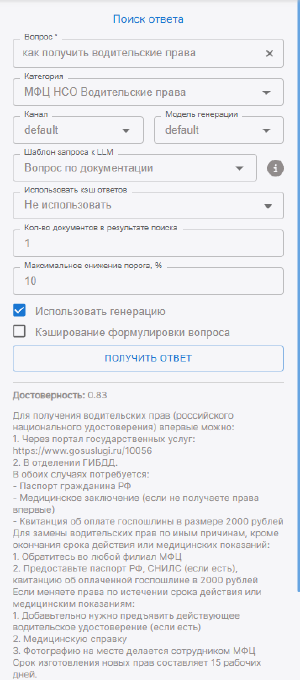Блок «Поиск фрагментов по базе» позволяет найти фрагменты, которые имеют векторную близость с вопросом, введенным в поле с названием «Вопрос». Под этим полем находится выпадающий список «Категория», если выбрать нужную из списка, модель будет искать совпадения в документах этой категории, иначе – во всех документах в базе. Результат поиска отображается снизу после нажатия на кнопку «Поиск». Теперь вы можете настроить количество документов, в которых будет осуществляться поиск фрагмента, соответствующего вашему вопросу. Это число определяется интуитивно: чем больше вы выберете документов, тем меньший контекст будет извлечён из каждого документа, что в свою очередь может привести к ошибочному ответу далее. Однако, если в категории более четырёх документов, не рекомендуется устанавливать значение более четырёх. Также можно указать "Максимальное снижение порога" в процентах (по умолчанию 10%). Он определяет допустимую разницу между максимальной и минимальной релевантностью фрагментов при фильтрации результатов.