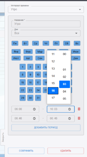 представляет собой классический календарь, который показывает текущий и следующий год. Это настройка конкретных интервалов времени, которые потом могут использоваться в качестве условий в действиях.