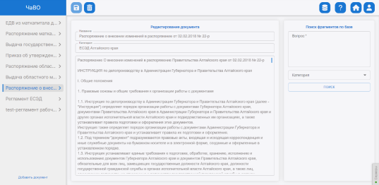 - блок «Редактирование документа» с полями: «Название», «Категория» и текстом выбранного файла, который можно редактировать. Можно переименовывать файл и название категории, после чего нужно сохранить изменения. Важно! После сохранения изменений требуется переинициализация базы данных с помощью кнопки «Переинициализация базы данных» на панели управления (см. раздел Панель управления).