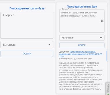 Блок «Поиск фрагментов по базе» позволяет найти фрагменты, которые имеют векторную близость с вопросом, введенным в поле с названием «Вопрос». Под этим полем находится выпадающий список «Категория», если выбрать нужную из списка, модель будет искать совпадения в документах этой категории, иначе – во всех документах в базе. Результат поиска отображается снизу после нажатия на кнопку «Поиск», предусмотрена возможность перейти к документу, кликнув по его названию напротив атрибута «Документ» (рисунок 5).