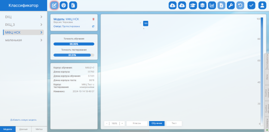 • Обучена. Доступен просмотр информации о точности обучения, параметрах модели и матрица ошибок.
