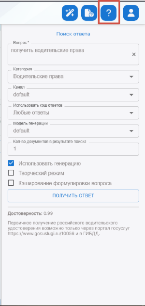 Также в блоке есть флажки «Использовать генерацию» и «Творческий режим» — он позволяет создавать более разнообразные ответы, стараясь придерживаться фактов из документа. Есть риск, что информация будет отличаться от той, что в документах. Флажок «Творческий режим» нельзя активировать без флажка «Использовать генерацию». Флажок «Кэширование формулировки» установите активным, если хотите чтобы вопрос попал в кэш (список вопросов). Если система найдет семантическую близость с каким-либо вопросом, который уже есть в списке, то добавит его в альтернативные формулировки. Если нет — добавит в список как новый вопрос. После заполнения всех полей и нажатия кнопки «Получить ответ», результат появится ниже. Показатель «достоверность» отражает процент достоверности ответа, основываясь на всех найденных фрагментах.