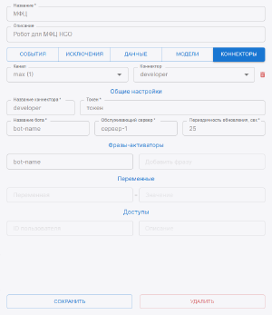 Вкладка Данные позволяет настроить процесс обработки сервисных данных, таких как согласие, отрицание, повторение и так далее. Для каждого элемента сервисных данных указывается его Тип (Класс или Сущность), Модель, из которой берутся данные, а также конкретный Класс или Сущность.