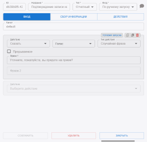 - завершение сессии — скрипты, которые могут выполняться после завершения диалога, если скрипт указать в настройках в действиях на событии «Завершение диалога»;